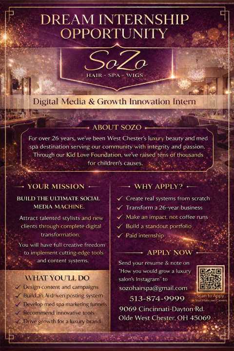 SoZo Hair, Spa & Wigs is now hiring Hair Designers and Nail Technicians for our facility in Olde West Chester at the corner of Cincinnati-Dayton and West Chester Roads.